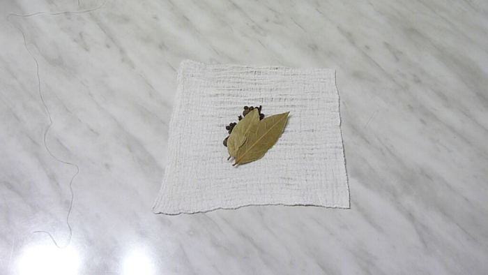 А еще я приготовлю волшебный, ароматный мешочек со специями. Для этого подойдет кусочек марли, сложенный в два-три раза. Также можно использовать широкий бинт, сложив его в несколько слоев. В центр я буду складывать специи: перец горошком (душистый и чёрный) — примерно пол чайной ложки, гвоздику целую и пару средних лавровых листочков. Можно один большой.