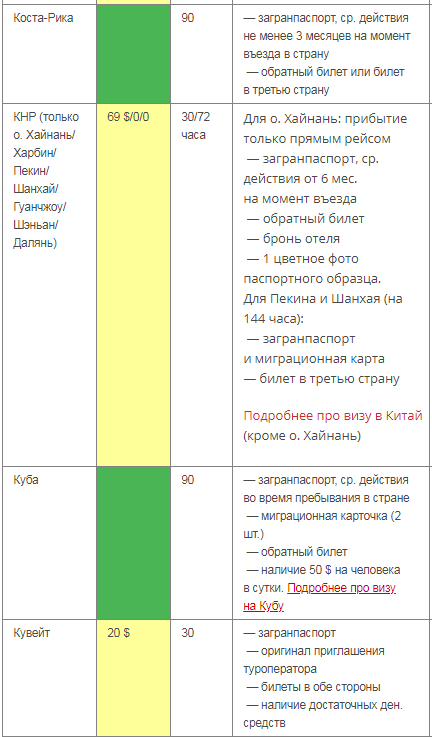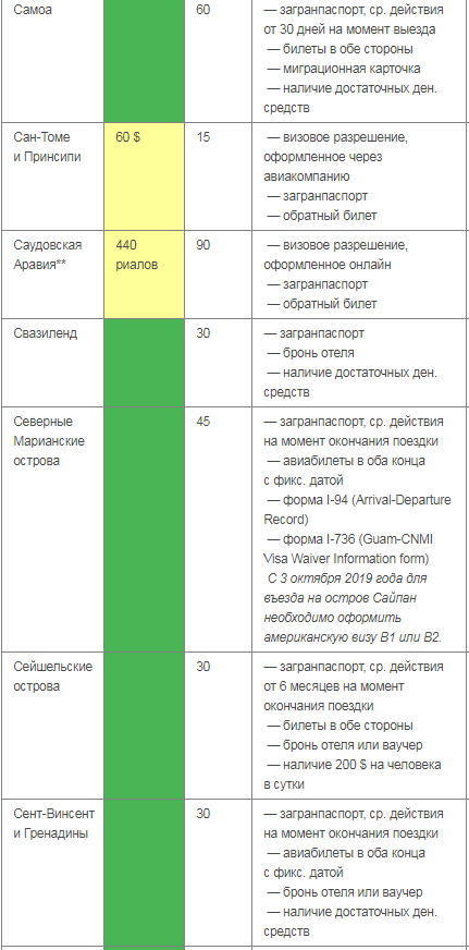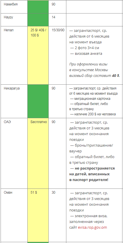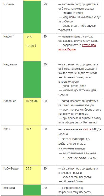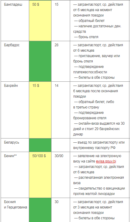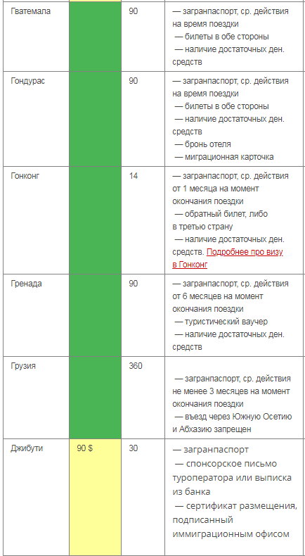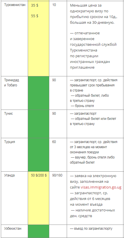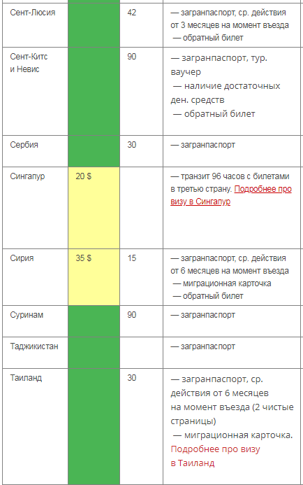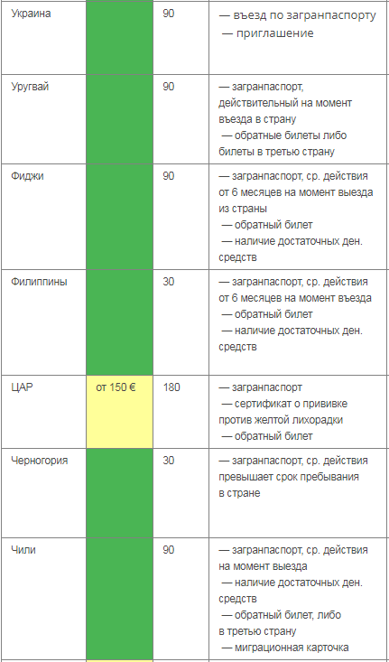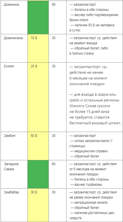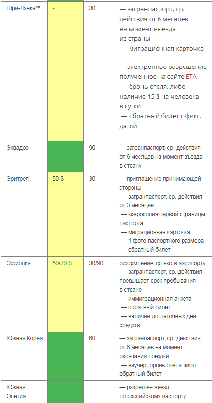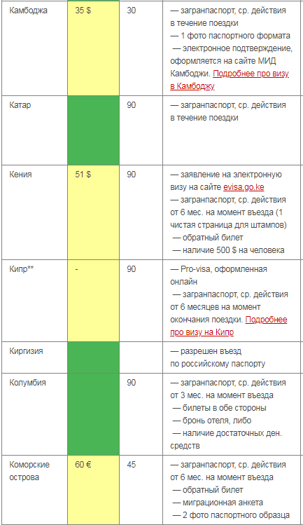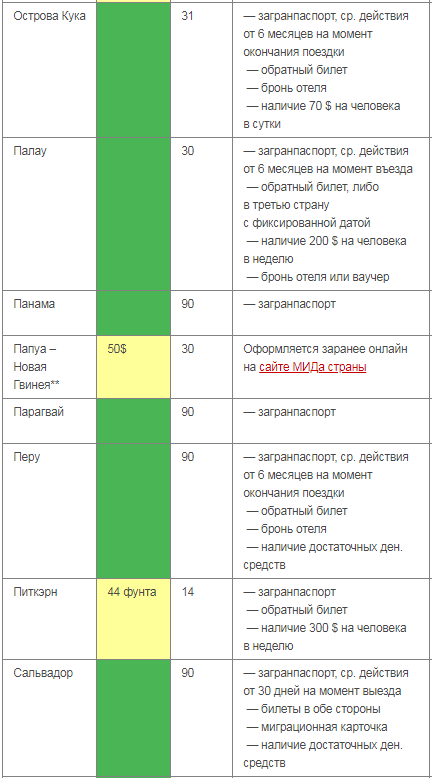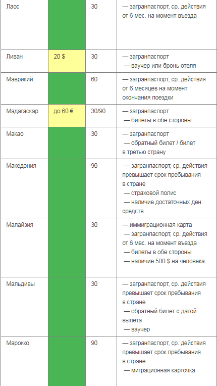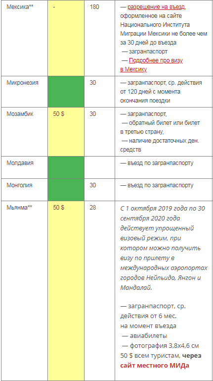 В посте перечислены как страны безвизового въезда, так и те государства, въезд в которые осуществляется по упрощенным правилам, то есть оформляется на границе. Также в таблице указано количество дней для пребывания в стране по упрощенной схеме и требуемый комплект документов.