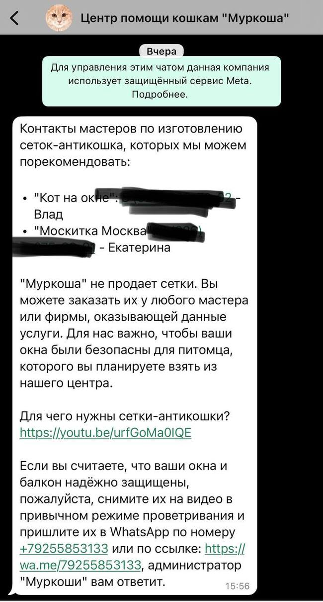 Даже если вы проходите собеседование, вам не отдадут кошку/кота, пока вы не пришлете видео, что на окнах установлены решетки, специальные для животных, которые не порвутся и не выпадут от давления на них.