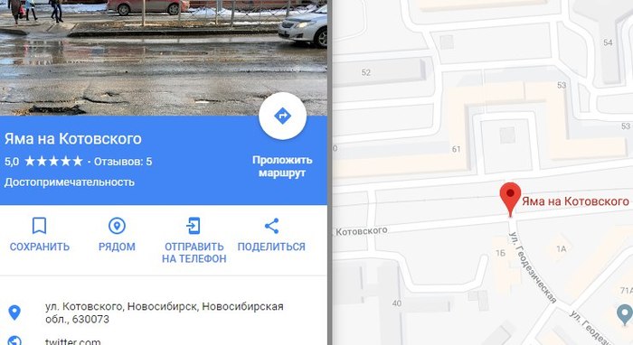 Яма на дороге в Ленинском районе Новосибирска появилась на картах Google. Ее добавили в раздел «достопримечательности».