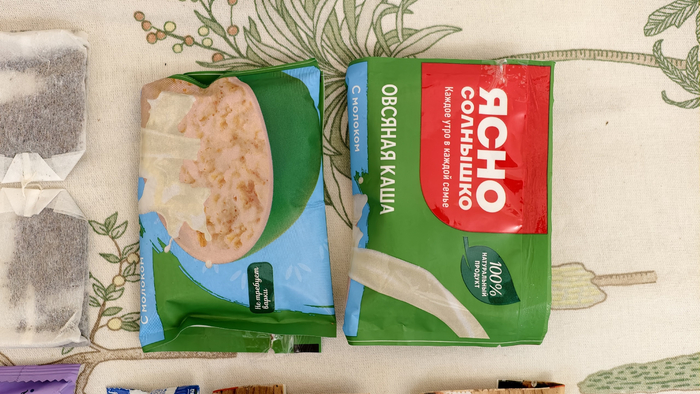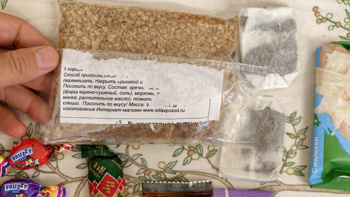 Гречневая каша «попроще» — два пакета. Мяса там я особо не замечал, но вроде что-то есть. Можно принимать, по сути, в любое время. С двух пакетов обещают 300 ккал. Я обычно ел с утра. Отдельно нужно отметить, что пакеты овсянки и обычной гречки идут с воздухом, и все не помещались в однодневный зип-пакет, поэтому я их надорвал, выпустил воздух и заклеил скотчем, все 40 пакетов.