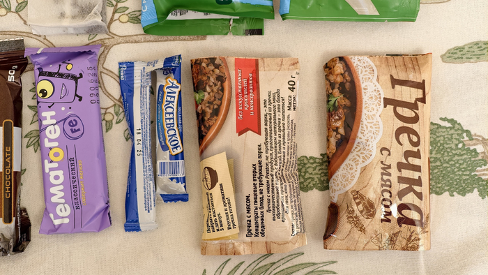 Главное блюдо — сублимированная гречка с мясом (@edavpoxod - беру уже видимо постоянно, пока цены не загибают как другие, но нужно уже сушить самому). Мяса там достаточно. Основной приём пищи я стараюсь планировать не на вечер, а на утро, чтобы энергии хватало надолго. Но если холодно, то лучше хорошо покушать как раз на ночь и утеплиться.
