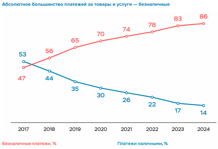 Доля безналичных платежей в розничном обороте составила 85,8%. Самым популярным средством безналичной оплаты остались платёжные карты. Выпущено их в родной стране (на 01.01.2025) 515,8 млн штук, или 3,4 карты на одного жителя. С их помощью в 2024 году было совершено 76,1 млрд транзакций на сумму 168,2 трлн ₽. Снятие наличных денег с использованием платёжных карт оставалось на относительно низком уровне. В общем количестве и объеме операций с картами на них приходилось 2,4 и 22,3% соответственно.