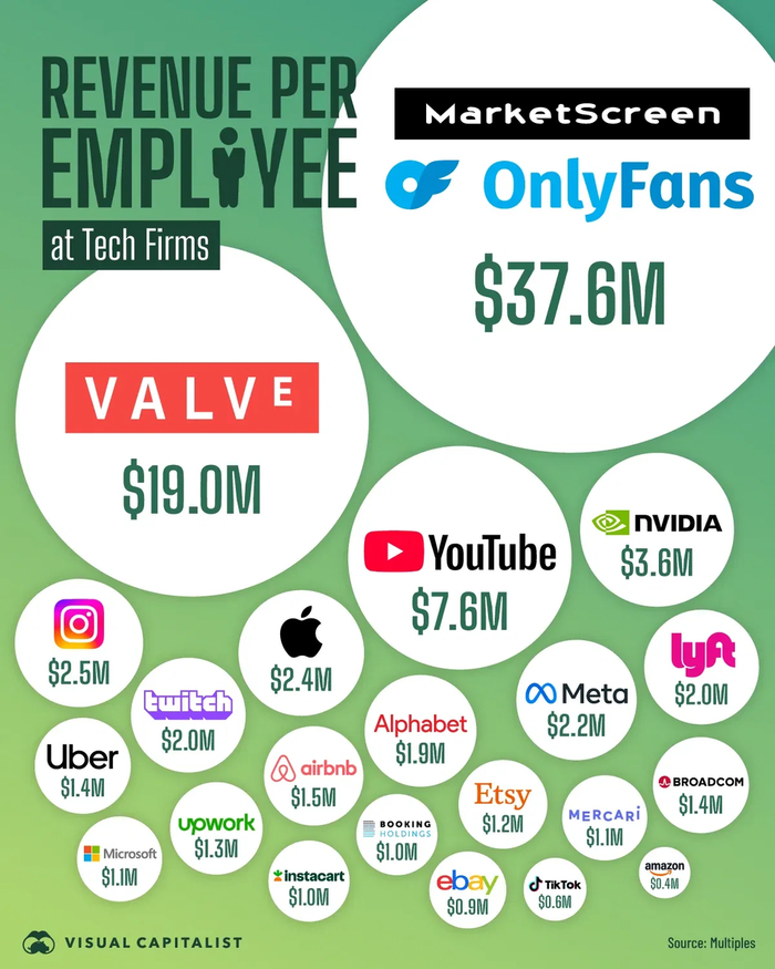 В 2024 году OnlyFans принесла 37,6 миллиона долларов дохода на одного сотрудника. Это значительно опережает другие платформы, такие как YouTube и TikTok.