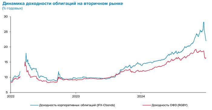Рост объемов размещений наблюдался и на рынке корпоративных облигаций, где портфель обращающихся бумаг (по непогашенному номиналу) увеличился на 5,8 трлн рублей (+22,9% г/г), до 30,0 млрд рублей.
