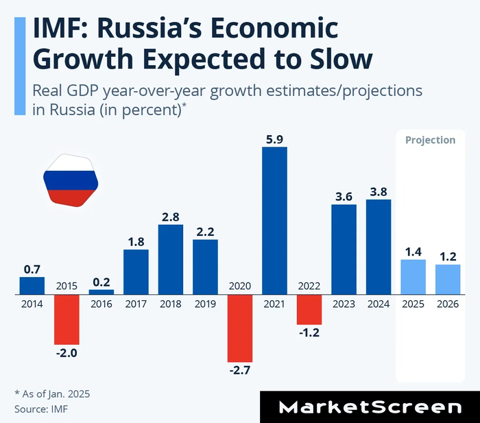Однако в 2025 и 2026 годах ожидается значительное замедление роста экономики России. Согласно прогнозам МВФ, ВВП страны вырастет всего на 1,4 % в этом году и на 1,2 % в следующем. Наблюдатели называют такие проблемы, как нехватка рабочей силы, рост цен и продолжающееся влияние санкций на внешнюю торговлю, например, в технологическом секторе, в качестве вызовов для России.