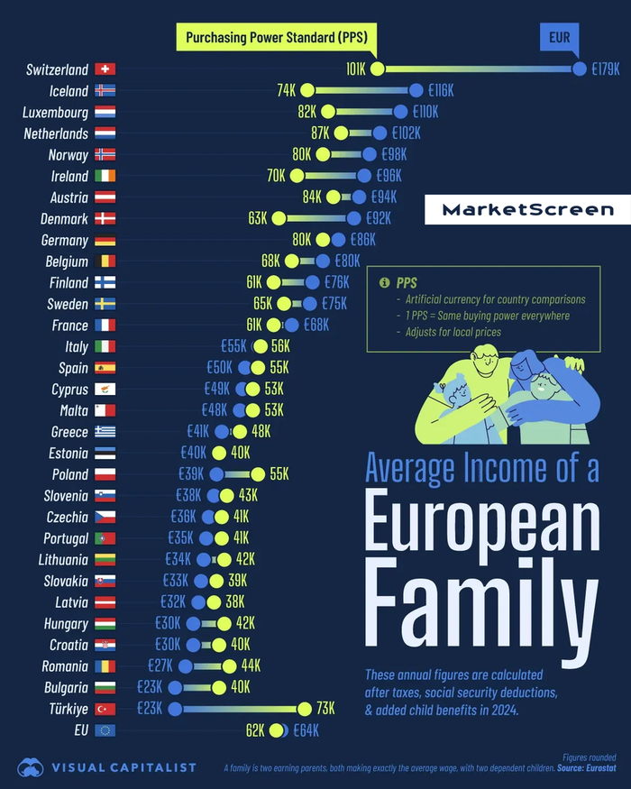 Доход семьи в Швейцарии является самым высоким в Европе и составляет 179 000 евро в год.
