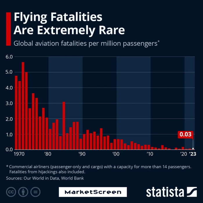Данные, опубликованные Всемирным банком и Our World in Data, показывают, что хотя авиакатастрофы всё еще происходят, они чрезвычайно редки, и за последние десятилетия коммерческая авиация стала гораздо безопаснее. В 2023 году на миллион пассажиров приходилось 0,03 смертельных случая, или, другими словами, три смерти на 100 миллионов. Согласно этим данным, 2023 год был вторым самым безопасным годом с момента начала ведения статистики, уступая только 2017 году, когда было зарегистрировано 0,01 смертельных случая на миллион пассажиров.