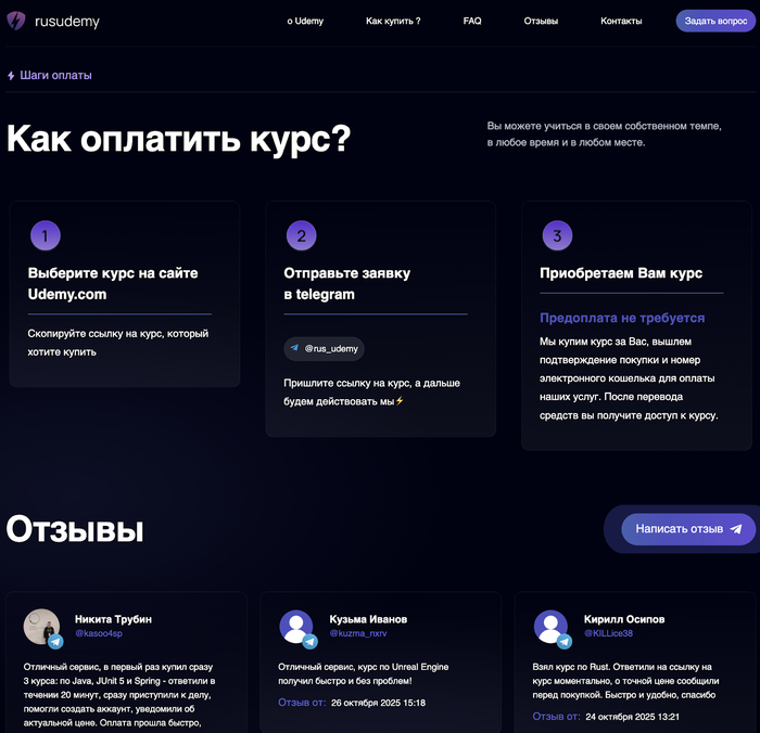 Плюсы: RusUdemy.com берут на себя оплату за Вас, предоставляют гарантии и поддержку; не нужна международная карта. Оплата осуществяется по СБП. RusUdemy существует с 2023 года, так же, имеет более 950 отзывов в Telegram, от людей с открытыми контактами. Сервис не требует предоплаты при покупке курса на новый аккаунт.