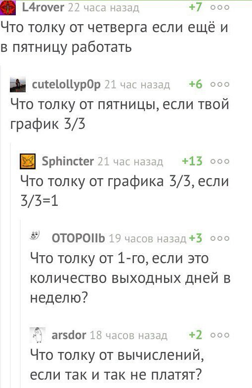 Жутко бесят посты: «УРА! Пятница, завтра отдыхать», «Идеальное утро субботы/воскресенья», «буду спать все выходные» - потому что, б**ь, я вообще без выходные работаю =(