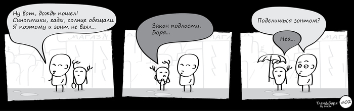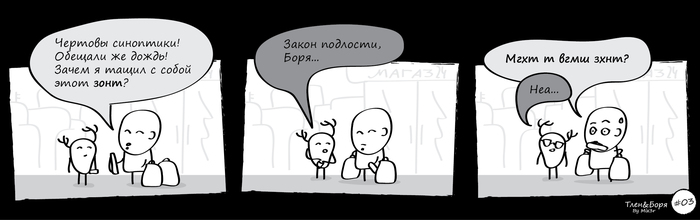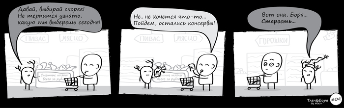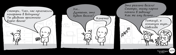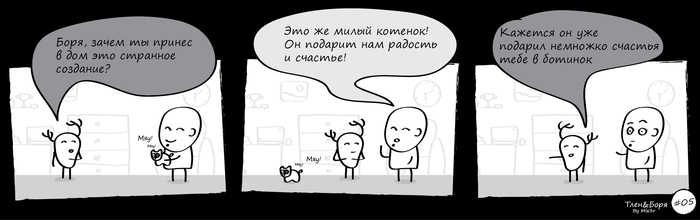 В свободное время я рисую простенький комикс про 25-30 летнего парня по имени Боря. Он типичный “компьютерщик”: не то дизайнер, не то программист, не то сисадимин. В общем, часто бывает за монитором и не часто бывает в обществе людей. У него есть необычный друг Тлен — абстрактное существо, похожее на фасолину с рогами. Очень любит кофе, отдыхать, шутить и особенно обламывать Борю, чем постоянно и занимается. Эдакое воплощение “закона подлости”. Живут эти персонажи у меня на страничке в ВК, но сегодня я решил немного расширить их географию и показать Борю и Тлена вам. В общем, это первые пять стрипов, нарисованных почти год назад. Если вам понравится — буду выкладывать еще (на данный момент имеется всего 13 стрипов).