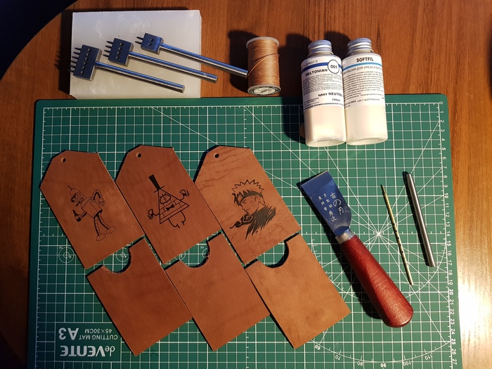 В итоге с "Призраком" при переносе на кожу херня случилась, а так как я его полтора часа пытался нормально напечатать на подложке, то заменил его Бендером. Запорол и перенос Наруто, но в итоге решил сошлифовать неудавшуюся попытку и нанести заново. По ощущениям, на шлифованную кожу ложится лучше, но это требует дальнейшей проверки.