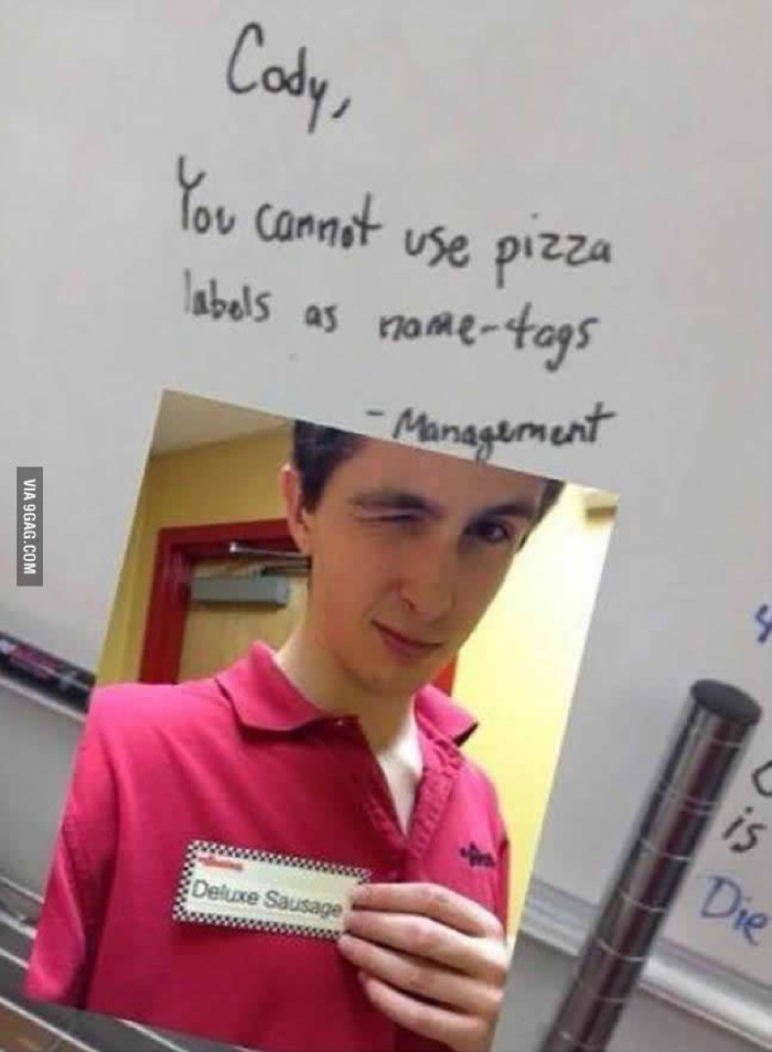 Коди, ты не можешь использовать название пиццы как именной бейджик