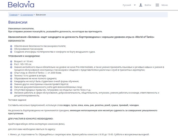 Белорусская авиакомпания "Белавиа" открыла вакансию бортпроводника, у которого есть опыт игры в World of Tanks. Причем, количество наигранных часов должно быть не меньше двух тысяч.