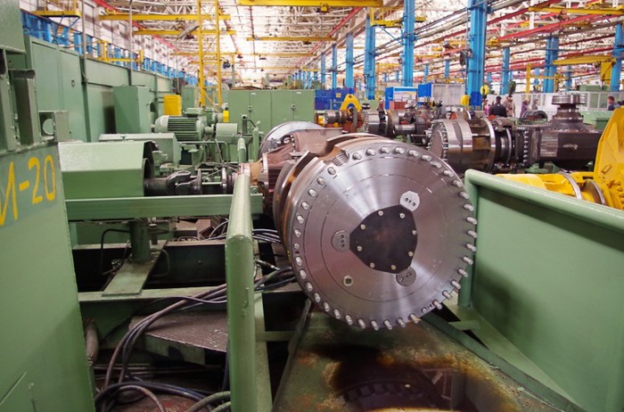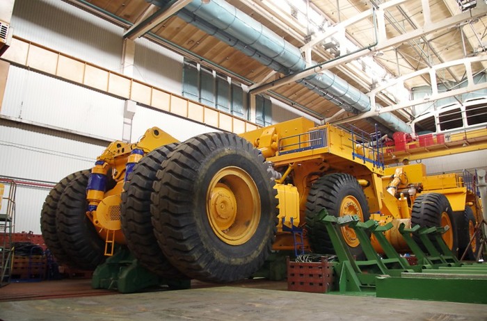 Здесь для доступа открыт главный конвейер и участок подготовки комплектующих. Первое, что можно увидеть при входе, — это участок сборки колес. Они последними устанавливаются на собранный самосвал. Вообще все, что по прямой на этом снимке, — это подготовка к производству. Сборка систем централизованной смазки, систем пожаротушения, сборка дизель-генераторов и мотор-колес. После все это передается на главный конвейер, который находится справа и устанавливается на собираемые самосвалы.