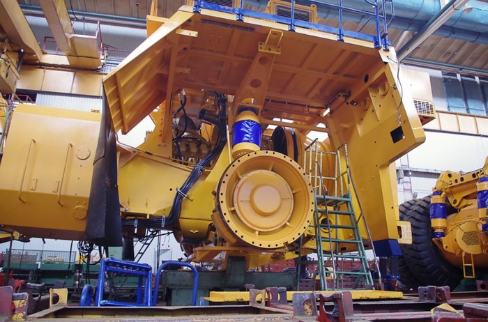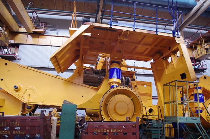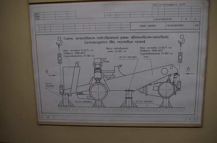 Вот здесь начинается конвейерная сборка самосвалов. Надо заметить, что БелАЗ чуть ли не единственный производитель в мире, собирающий карьерные самосвалы конвейерным способом.