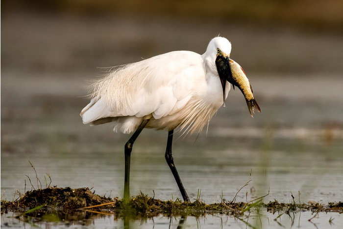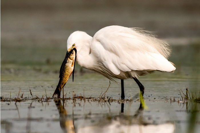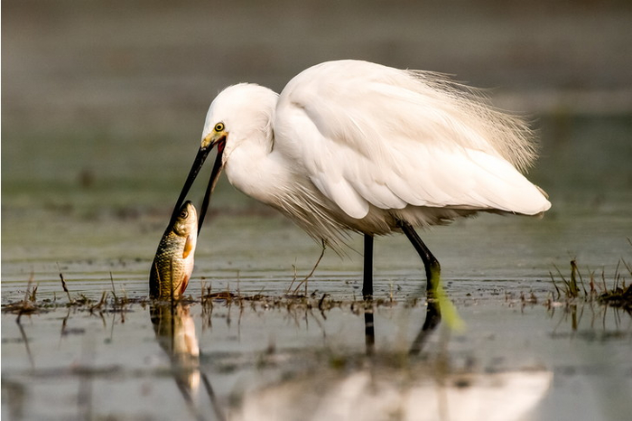 Малая белая цапля поймала рыбу в пойменном озере реки Ганг. Птица едва не упустила свою добычу, но в итоге рыбе не удалось спастись.