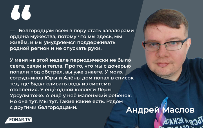 А про «немужественных» — белгородцам всем в пору стать кавалерами ордена этого самого мужества, потому что мы здесь, мы живём, и мы умудряемся поддерживать родной регион и не опускать руки. У меня на этой неделе периодически не было света, связи и тепла. Про то, что мы с дочерью попали под обстрел, вы уже знаете. У моих сотрудников Юры и Алёны дом попал в список тех, где будут сливать воду из системы отопления. У ещё одной коллеги Леры Урсулы тоже. А ещё у неё маленький ребёнок. Но она тут. Мы тут. Такие какие есть. Рядом с другими белгородцами.