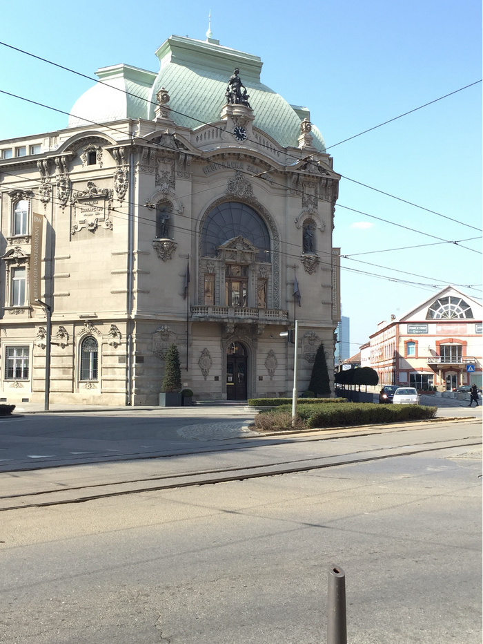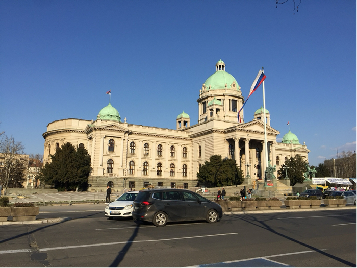 Местный парламент. Возле него всегда были какие-то люди с транспорантами то за Россию, то за Сербию, то за объединение Югославии, всегда по-разному