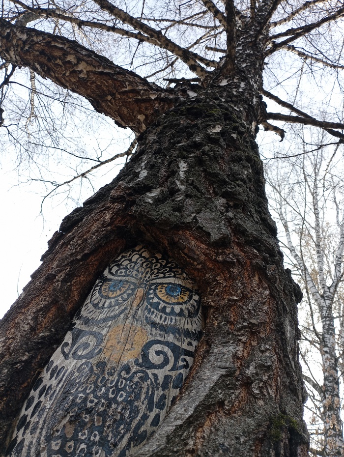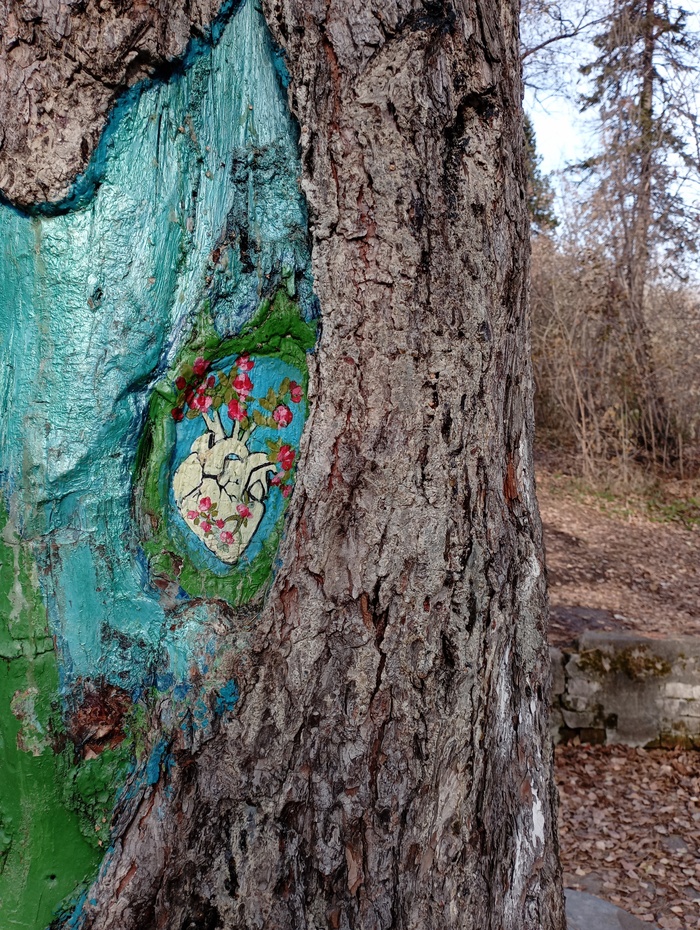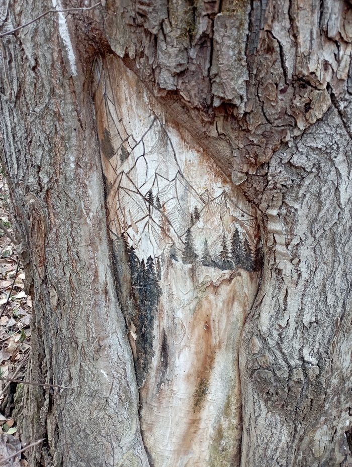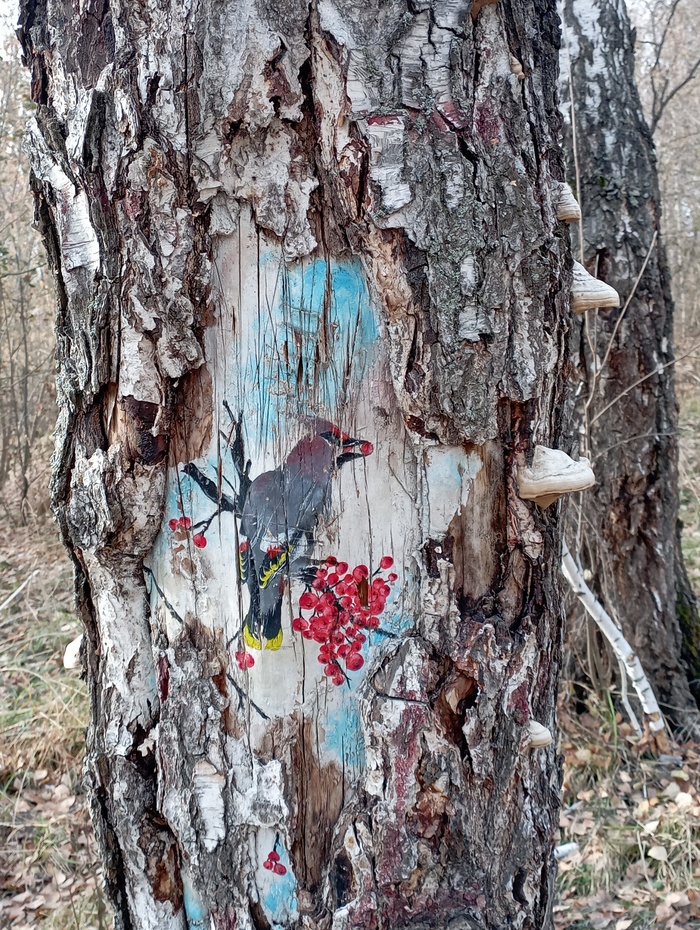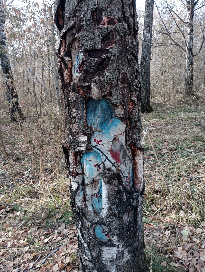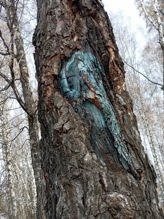 Это бурундучье дерево, летом я ложила на него орешки и по стволу приходил бурундук. Один раз даже из рук набрал полные щеки орехов. Сегодня довольно холодно, есть мысль может бурундуки уже спят? Давно их не видела.