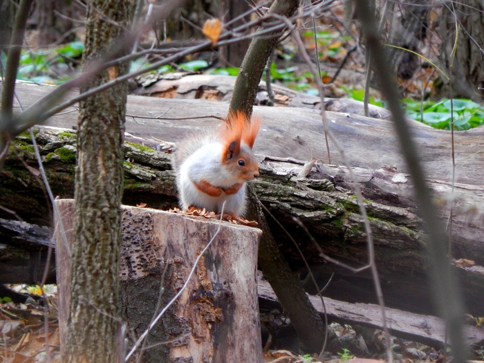Маленькая белочка замахала хвостом и убежала. Это недружелюбный знак. Видимо почувствовала какую-то опасность.
