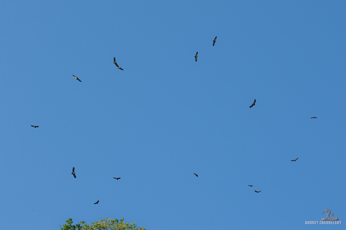 Белоголовый сип, очень крупный гриф, с размахом крыльев почти до трех метров. Устраивают в небе "карусели" из 10-20 особей высматривая падаль. Говорят способны загонять стада копытных к обрыву, чтобы какой-нибудь незадачливый барашка упал и разбился им на обед. Высоко в горах они смотрят прямо на тебя, когда шумно пролетают почти над самой головой, видимо надеясь что ты в страхе, им на радость, бросишься с обрыва. А еще как и лебеди они образуют пары на всю жизнь, но почему то грифов никто не воспевает и не романтизирует, потому они никого не любят и мечтают выклевать вам печень.