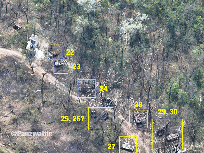 Во-первых, целую орду БМП-1. Однозначно идентифицируются номера 6, 7, 11, 12, 20, 21, 15, 16 и 19. Около 12 можно разглядеть башенку. Восемь штук, плюс три на предыдущем кадре. Двенадцать «копеек». Да, номер 6 — это БМП-1, она лучше видна на другом кадре.