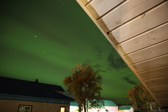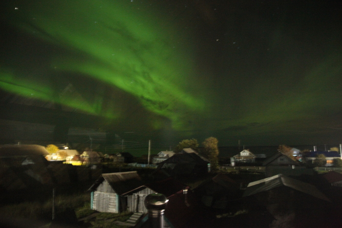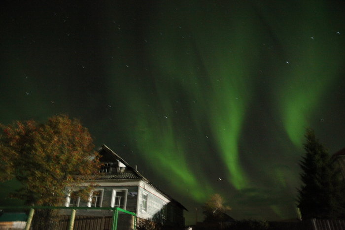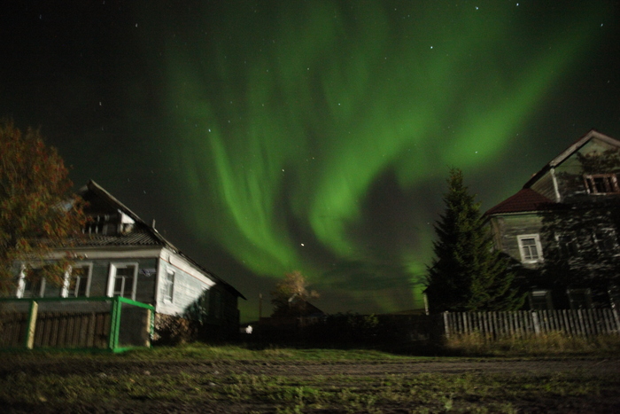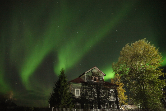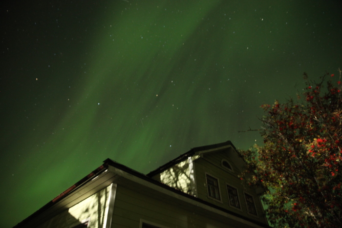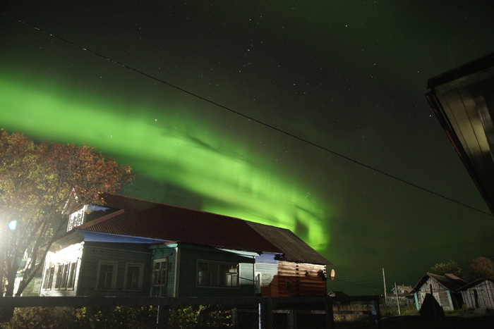 Набрасываю поверх ночнушки куртку, ныряю в сапоги, хватаю камеру, бегу на улицу. Вьются небесные зелёно-золотые змеи – споло́хи по-здешнему: над морем, над домами, над лесом. Даже и голову задирать без надобности, куда ни глянь – всюду они. Сколько лет я мечтала увидеть северное сияние, сколько кино о нём переглядела, и вот оно – не в кино, а в жизни. В моей жизни, вживую.
