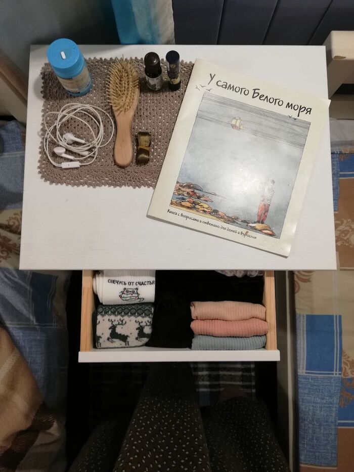 Это небольшое жильё, созданное для уединения и тишины. Внутри оно постепенно обретает уют — почти такой же, как в старом гараже, где всё под рукой и всё на своём месте. Снаружи — простор и холодное дыхание Белого моря. Здесь нет суеты, людей немного даже в жаркий сезон. Вместо этого — крики чаек, соседские котики и вечные закаты в окно.