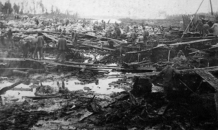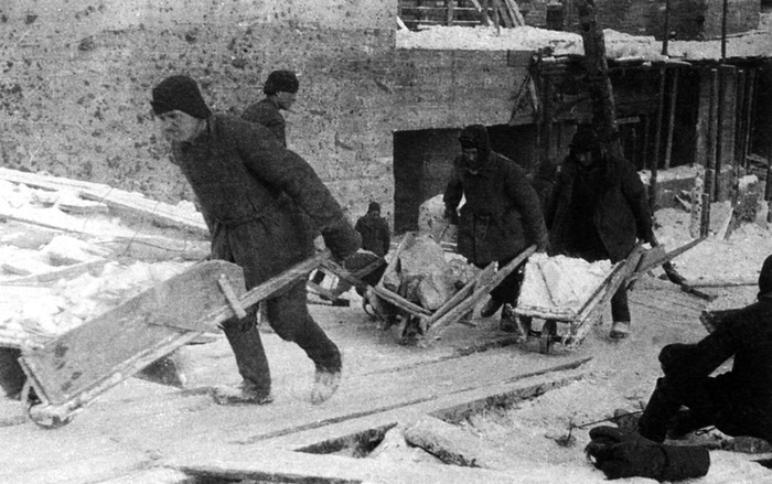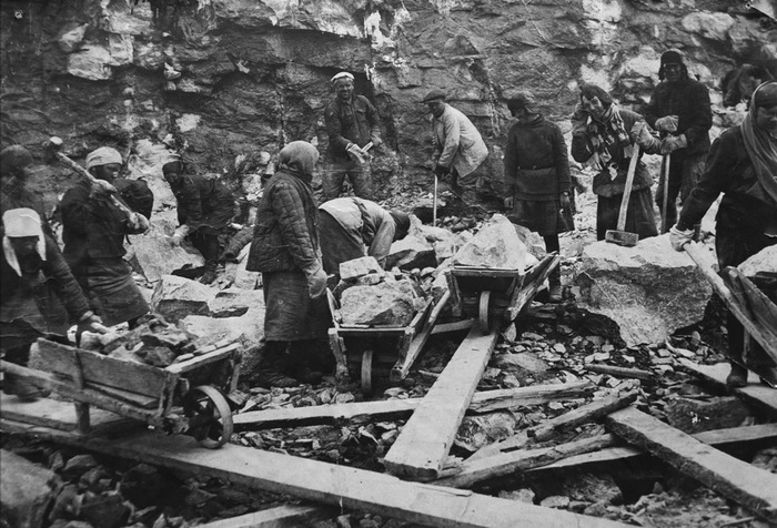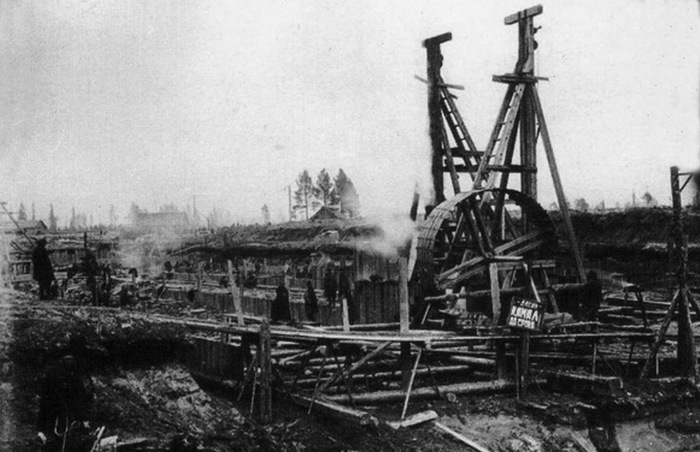 Все это - в сложных природно-климатических условиях (а попросту-в болотах)и почти исключительно - вручную, по средневековым технологиям(какой экскаватор? Может вам еще и самосвал дать?). На стройке не было ни одного экскаватора, бульдозера, грейдера, не было даже грузовиков. Лишь в отдельных местах применялись отбойные молотки и динамит для дробления скал, но, судя по фотографиям, в основном их долбили кувалдами.