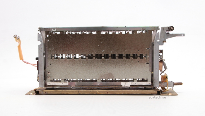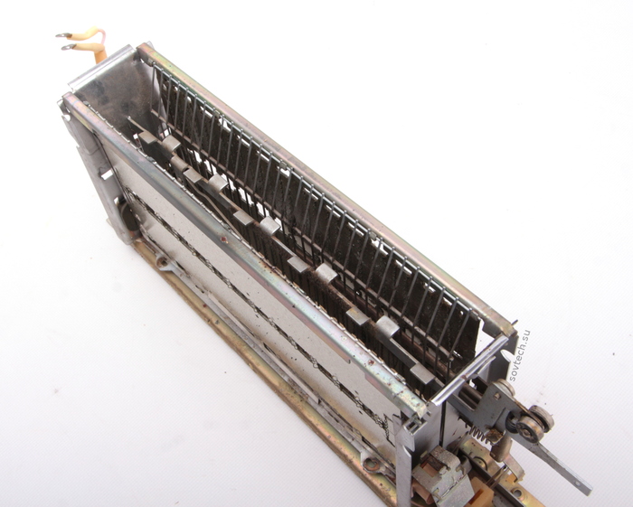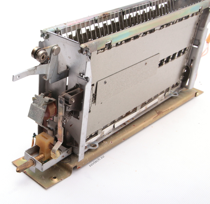 Механизм несколько отличается от предыдущих тостеров. Специального прогревателя для биметаллической пластины нет, и она взаимодействует не напрямую с защелкой, а с контактами, которые управляют электромагнитом освобождения защелки. Регулировка времени - также изменением расстояния перемещения толкателя.