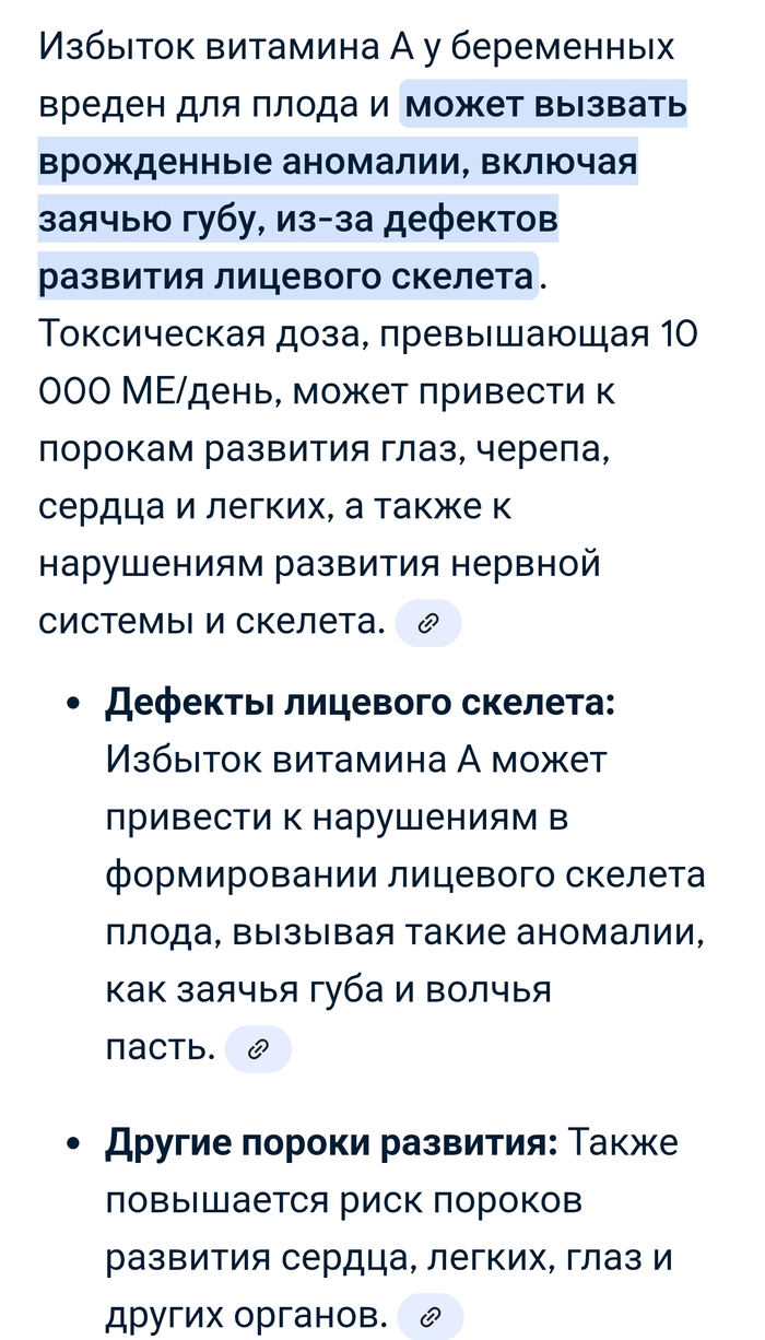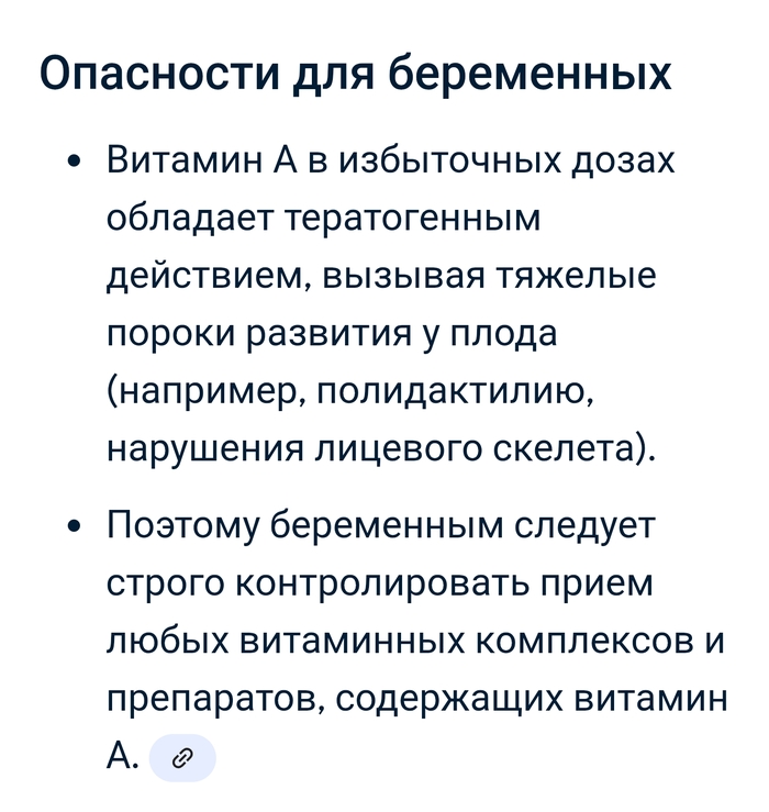 Специально уточняю, что бы "половина Пикабу" теперь не стала думать, что витамин А вреден для беременных. Наоборот очень полезен. И поэтому организм беременной сразу отправляет этот витамин плоду. Но если витамина А очень много то...