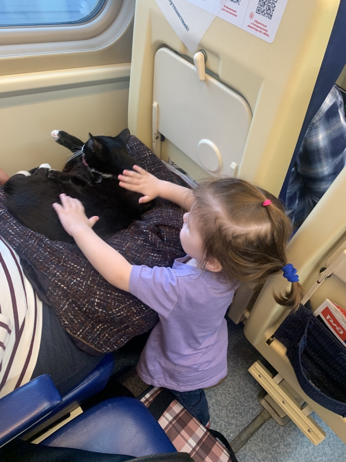 А там вот такие соседи. Дочь обожает кошек. У нас собаки, а тут целых две кошки на соседних креслах. Курсировала от одной, к другой.