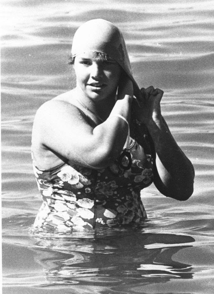 Восемнадцатилетняя Линн Кокс готовится начать заплыв по проливу Кука между Северным и Южным островами Новой Зеландии, 4 февраля 1974 года