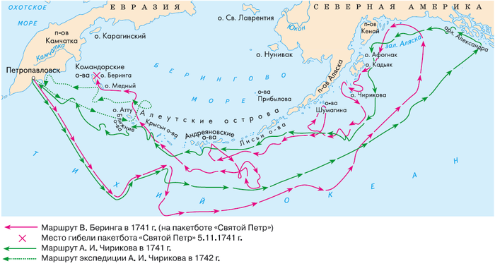В 1740 году отряд Беринга, построив суда «Святой Пётр» и «Святой Павел», переправился на Камчатку, где ими был заложен порт, названный Петропаловской гаванью (современный Петропавловск-Камчатский). В июне 1741-го отряд Беринга вышел в море и двинулся на юго-восток, однако вскоре во время сильного шторма суда под командованием Беринга и Чирикова потеряли друг друга из вида.