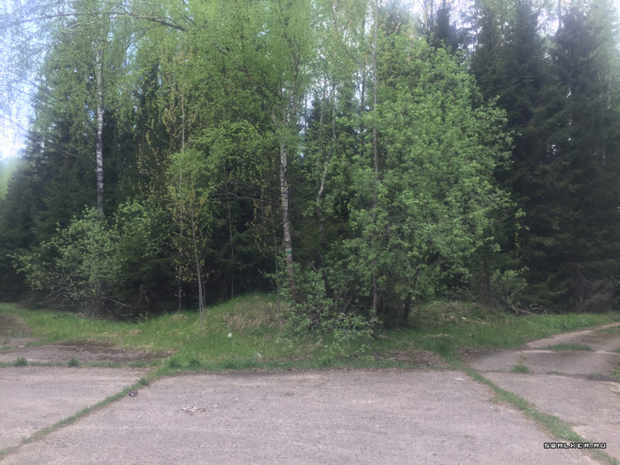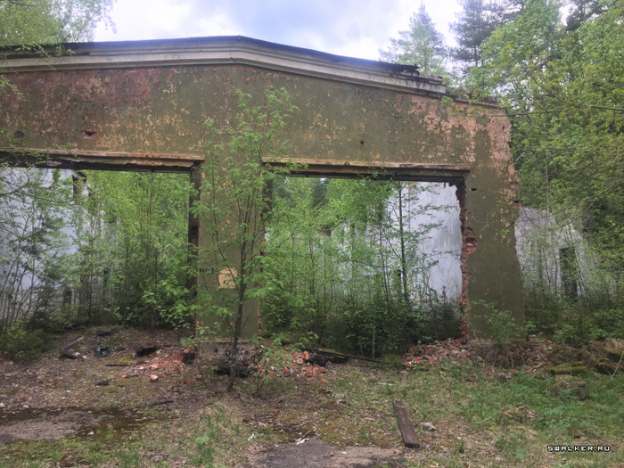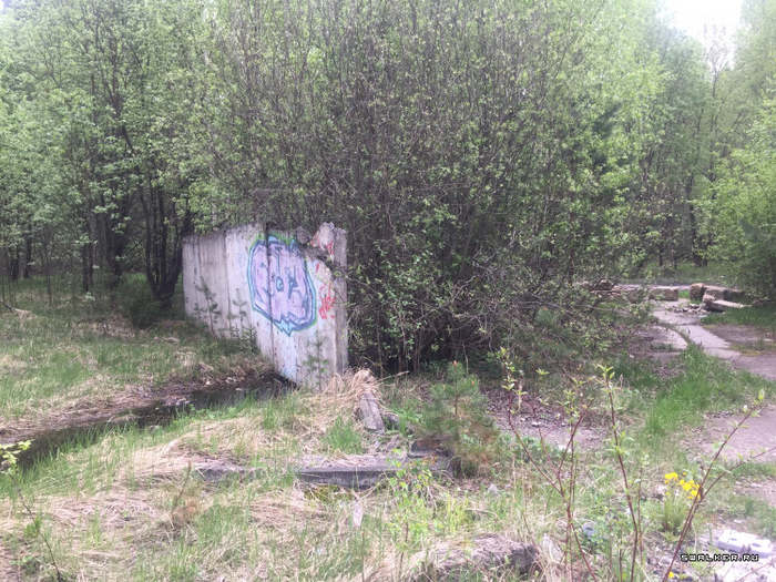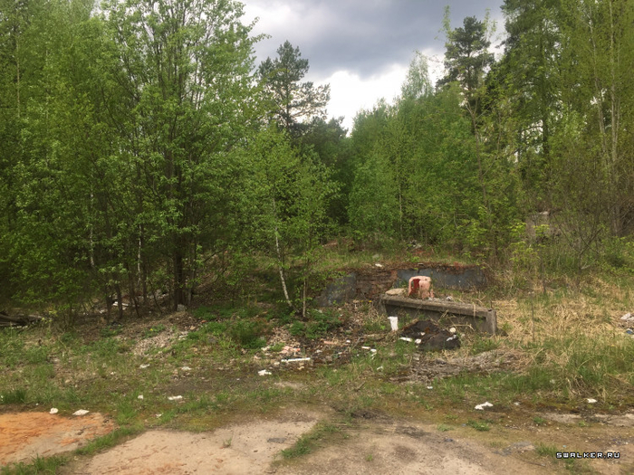 Далее раньше находился КПП. От него остался лишь фундамент, гора кирпичей и пара секций бетонного забора.