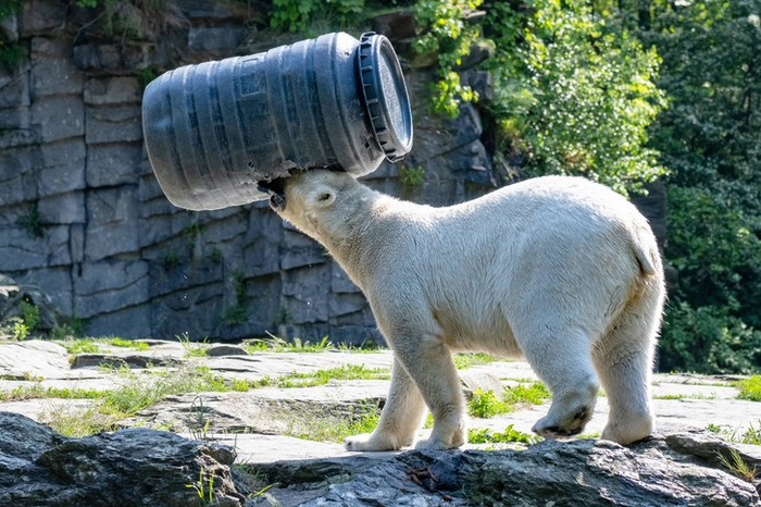Белая медведица из Берлинского зоопарка с наслаждением прыгает в воду, чтобы спастись от жары.
