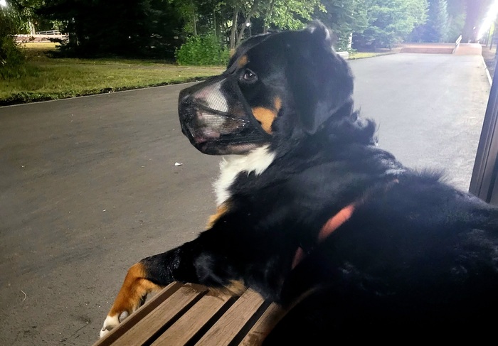 Намордник купила сетчатый легкий. Плюс: не жрёт на улице, минус: валяется в попытках снять и тыкается им в ноги.