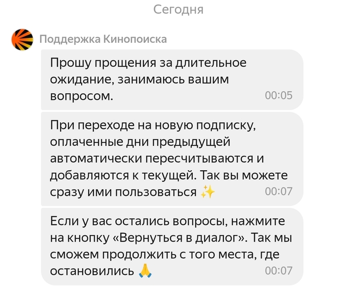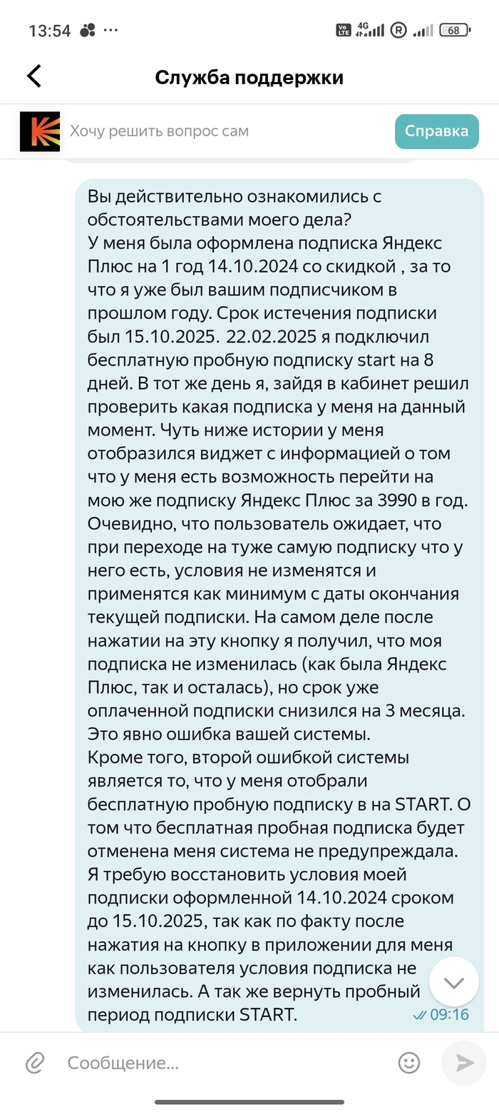 Именно за такую цену 4 месяца назад я приобрел у Яндекс их подписку по их спец предложению для уже являющихся их подписчиками. Ну думаю, понятно. Баг в софте. При подтверждении мне сбросили срок подписки по новой цене. Очевидно же что баг. Подписка не изменилась. Как была Яндекс Плюс так и осталась. Да и пробник сбросился. Сейчас мне техподдержка все починит. Пробиваюсь через бота волшебным заклинанием "Соедините с оператором". Описываю проблему. Время 23:05.