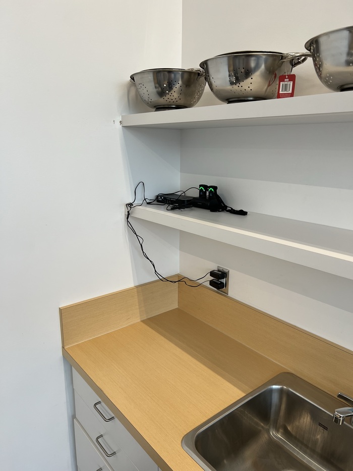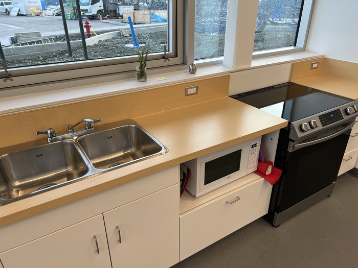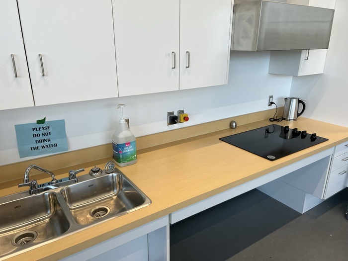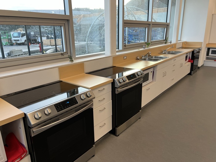 Отличная техника. Посуда. Раковины. Ингредиенты для еды. Несколько аварийных кнопок (их видно на сетене): Ученики там делают настоящие блюда:
