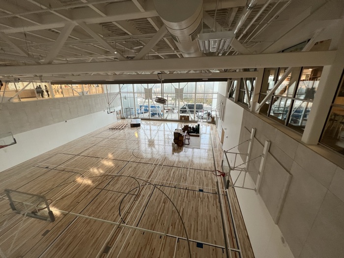 Классный, очень светлый спортзал с гигантским окном-стеной. Также на него выходят окна с коридоров школы:
