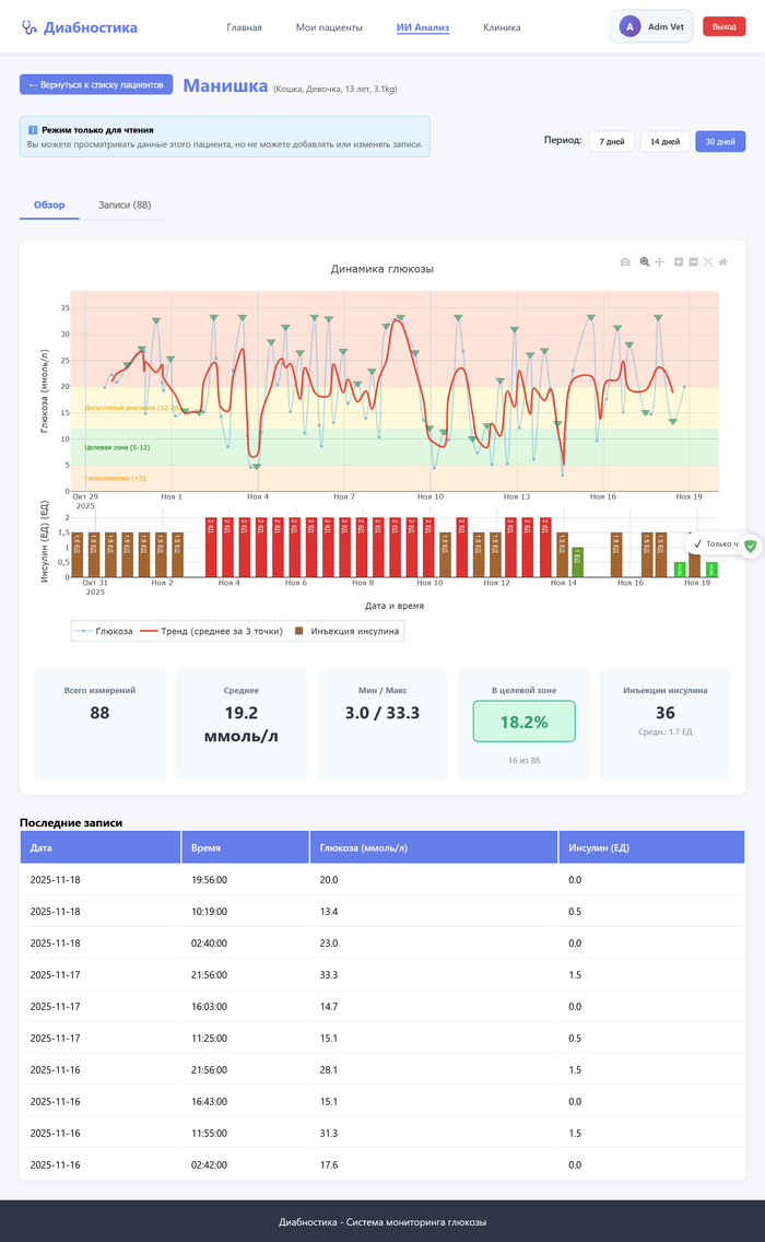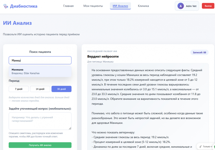 Манишке пока не идеально, средний сахар высокий. Но процесс идёт, закономерности видны, с ветеринаром разговариваем по делу с цифрами в руках. Это уже прогресс.