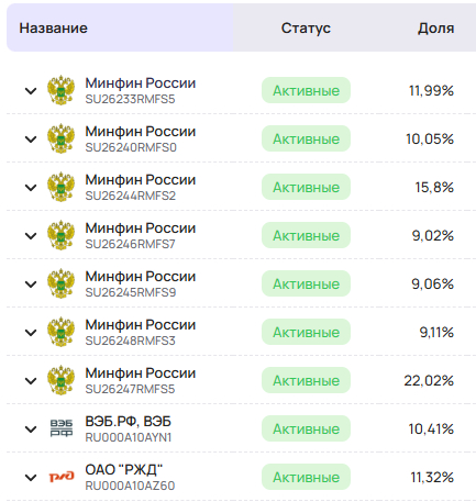 3) Фонд "Крупнейшие компании РФ" (TMOS) в сумме 115 тыс руб. Поступающие дивиденды автоматически реинвестируются обратно в фонд.
