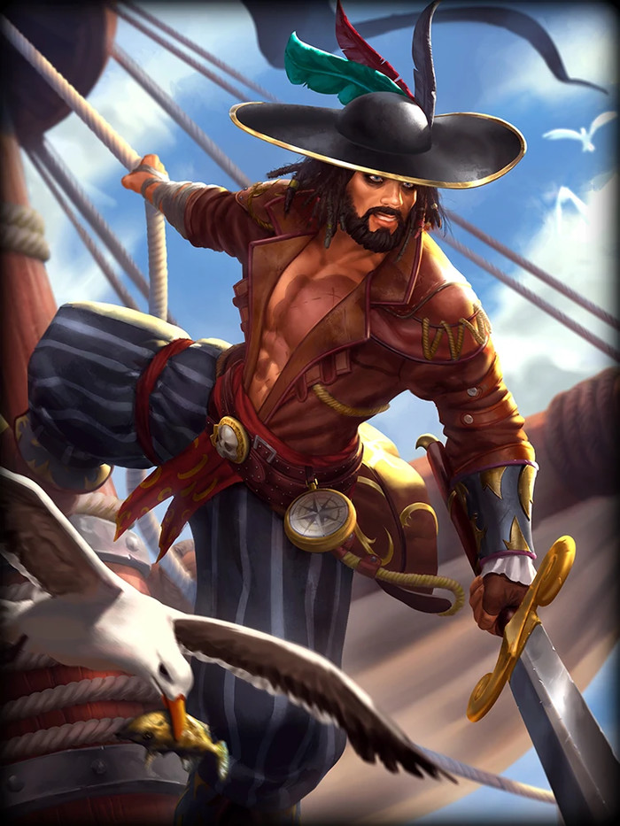 Дальше идёт скин на японского бога летней бури, страстного поклонника своей сестры, Суссаноо. Скин Swashbuckler (Головорез), при одном только взгляде напоминает персонажа серии диснейевских фильмов "Пираты Карибского моря", Джека Воробь... Простите Капитана Джека Воробья.