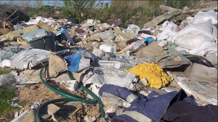 [Смотрим фото общий вид свалки, сломанные контейнеры на дороге, мусор у забора сада, летящие пакеты.]