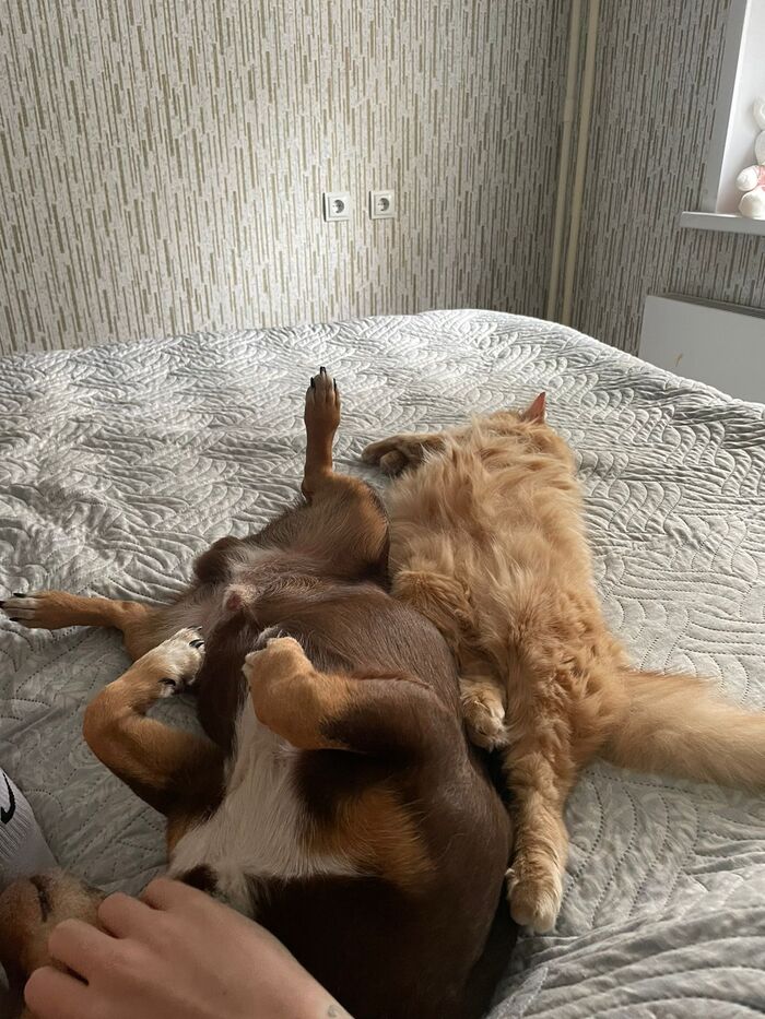 Рыжий лохматый это Мичман, а белый в пятнышко Юнга.
