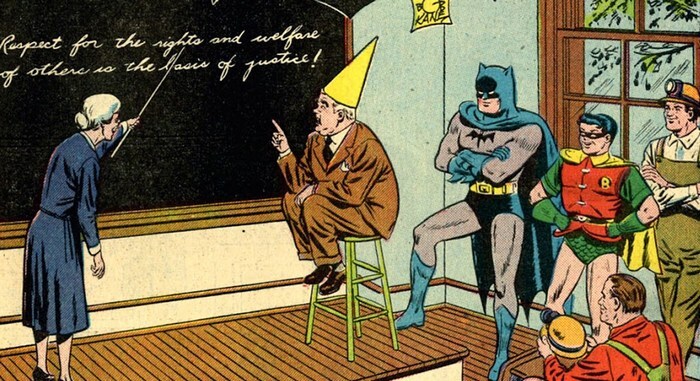 Значит, пора перейти в комикс Detective Comics #111. Беда в небольшом шахтёрском городке Глейдвиль, обвал в шахте, шахтёры застряли под землёй. Казалось бы, работа для Супермэна, но его поблизости нет, зато мимо городка проезжают Брюс Уэйн и Дик Грейсон и решают остановиться и помочь. Бэтмэн и Робин становятся свидетелями напряжённого разговора – Салли МакГроу винит Тодда Рида в том, что его отец, владелец шахты, не установил нормальные вентиляторы и иные средства безопасности. Но она смягчается, когда Тодд помогает достать её отца из-под завалов. Всё же, много других шахтеров погибло, и их родственники винят Тодда. Бэтмэн присоединяется. Тодд в непонятках. “Так а ч0 я-то, шахтой заведует мой батя! – Ну так пора уже унаследовать его дело и взять ответственность в свои руки! Ну или хотя бы бате на мозги прокапать”. Тодд идёт к бате, но батя стоит горой: “Будем оспаривать в суде любые иски, а нормальная вентиляция и прочее оборудование для безопасности это трата денег, и я не лох деньги тратить, а за забором очередь из шахтёров всегда найдётся, эти помрут – других наберём”. Пожилая учительница, Эмма Додд, которую все в посёлке любят, собирает пикет против отца Тодда, но школой он тоже владеет, и увольняет учительницу, и обещает в случае дальнейших пикетов использовать силу, пусть в пикете и участвуют старики и дети.