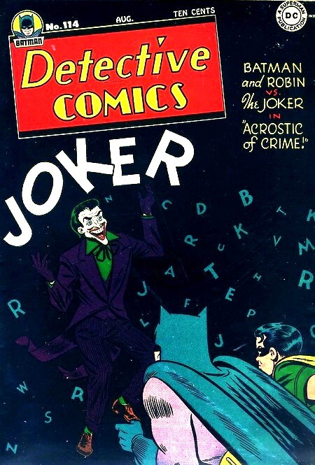 Поскольку Загадочник в комиксах ещё не дебютировал, в выпуске Detective Comics #114 загадки загадывает Клоун-принц преступности. В газете появляется объявление: “Челлендж от Дерзкого, Жёсткого, Офигенного, Крутейшего, Единственного, Распрекрасного, Болвану, Экстракту Тупизны, Малоумному Эгоистичному Неандертальцу! Каждый вечер на Готэмской площади будет высвечиваться какая-нибудь буква, с которой будут начинаться три слова, подсказывающих, где я нанесу удар! Сможешь всё разгадать?”. Первая буква - J, Дж. Джокер грабит здание суда, здание правосудия, где судьи отправляют преступников в тюрьму (Justice, Judges, Jail). Всё сходится. Но поймать Джокера с первого раза не удаётся – он бросает в Бэтмэна и Робина моток колючей проволоки, в которой герои оперативно запутываются. Пока выпутываются, Джокера и след простыл.