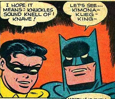 На следующую ночь появляется буква О. Ну, тут вообще не проблема – очевидно же, что Джокер появится на торжественном Открытии Оперы, где будут играть Отелло. И на этот раз ему тоже удаётся Обойти героев с помощью граммофона с записью своего хохота – пока Бэтмэн и Робин мечутся в поисках Джокера, он грабит посетителей и сваливает. Следующая буква К – Джокер собирается похитить бриллиант Кан, принадлежащий Королю Моравии, из ювелирки мистера Найта (Knight). Против подоспевших героев Клоун-принц преступности выпускает боевитого кенгуру. И сбегает, пока Бэтмэн держит отчаянно брыкающуюся тварь, а Робин надевает ей на башку мешок, чтобы дезориентировать. Далее следует буква Е, и героям приходится разделиться – Робин отправляется к зданию Electrical Engineering Enterprise, Бэтмэн – на выставку (Exhibition) Экселлы Эрмин. Робин таки натыкается на Джокера, получает по голове – но ему удаётся найти способ вызвать Бэтмэна. И общими усилиями Джокера побеждают. “Б – значит, бью. Э-энергично. Т-тебя. Э-энергично ещё раз. Н – не щадя!”. Побив, Джокера сдают властям и над ним все потешаются. “Последнюю букву в твоей аббревиатуре, Р, поставил Робин, загнав тебя в ловушку!”.