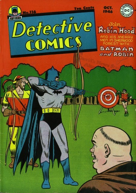 Да и фиг с ним, давайте займёмся комиксом Detective Comics #116 за октябрь 1946 года. Некоторое время назад в сольнике Batman дебютировал учёный Картер Найколс, техника которого позволяет отправиться в прошлое, пусть и не на самом деле. Ну то есть, это не полноценное путешествие во времени, а что-то вроде самых первых Ассассинс Крид. Ну, почти. Подопытных погружают в гипноз и они видят образы прошлого, но не рискуют сломать таймлайн. И сейчас Брюс Уэйн и Дик Грейсон таким способом отправляются в 13 век, ибо Робину давно пора познакомиться с Робин Гудом. И практически сразу начинается экшен – Шериф Ноттингемский кошмарит едущих через лес Весельчаков и леди Мэрион, но за них вступаются сначала Бэтмэн и Робин, а затем и подоспевший Робин Гуд. Шерифа удаётся посрамить, тот спасается бегством, и Робин Гуд приглашает Динамический Дуэт в свою лесную обитель. А Шериф всё планирует, как бы Робин Гуда прищучить, и потому объявляет турнир, наградой за победу в котором будет золотая стрела и мешок золота. Разве можно такое пропустить?